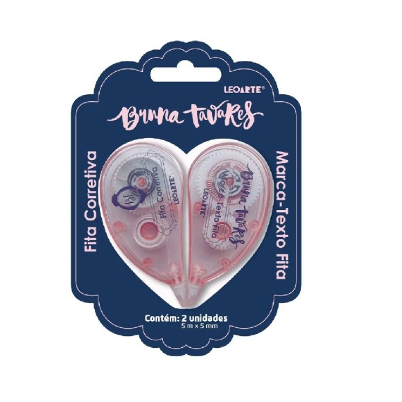 Juntos, os 2 produtos Fita Corretiva + Marca-Texto Fita Bruna Tavares formam um coração quando posicionados no blister, ficando muito delicado e atrativo visualmente.