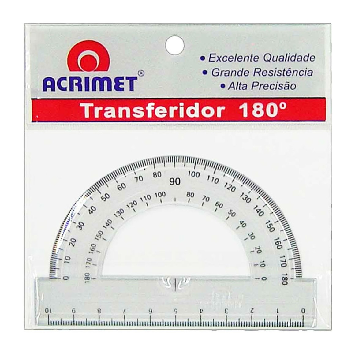 Transferidor em poliestireno, com escala gravada por transferência de imagem, garantindo alta precisão.