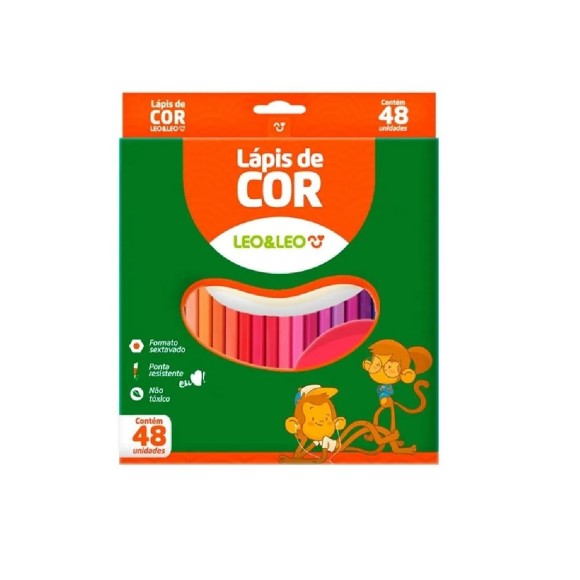 O Lápis de Cores Leo & Leo é seguro e resistente, próprio para a fase escolar. A caixa possui 48 cores, mina macia e resistente, corpo sextavado que não escorrega na mesa.