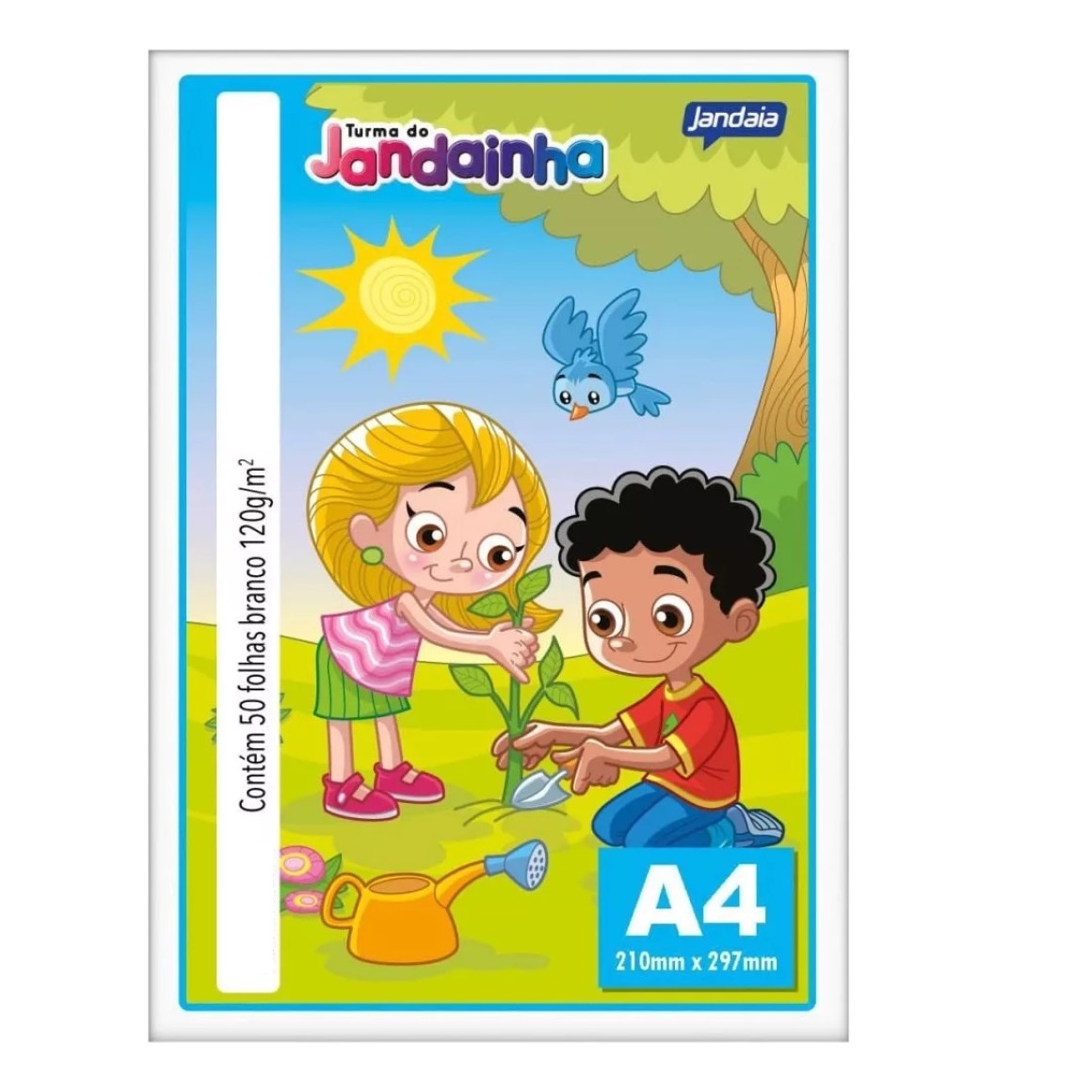 O papel sulfite da turma do Jandainha é ideal para a pintura, trabalhos em geral, impressão, colagem, desenho e cópia. Além de conter as folhas, sua embalagem também é 100% reciclável.