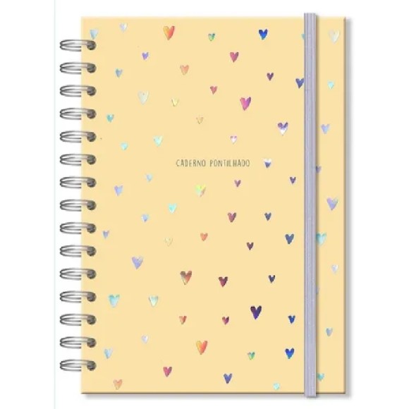 O Caderno Espiral amarelo com corações holográficos, capa dura, 1/4 com miolo pontilhado, 96 folhas em papel offset 90g, formato 14.5x20,5cm, encadernação wire-o, elástico para fechamento. Acompanha folha de adesivos. Ideal para o dia a dia na escola ou na faculdade.